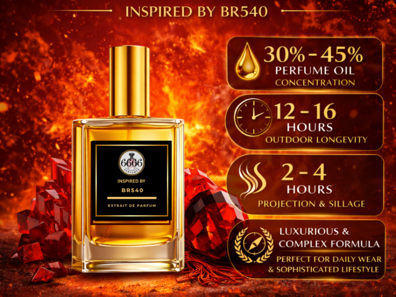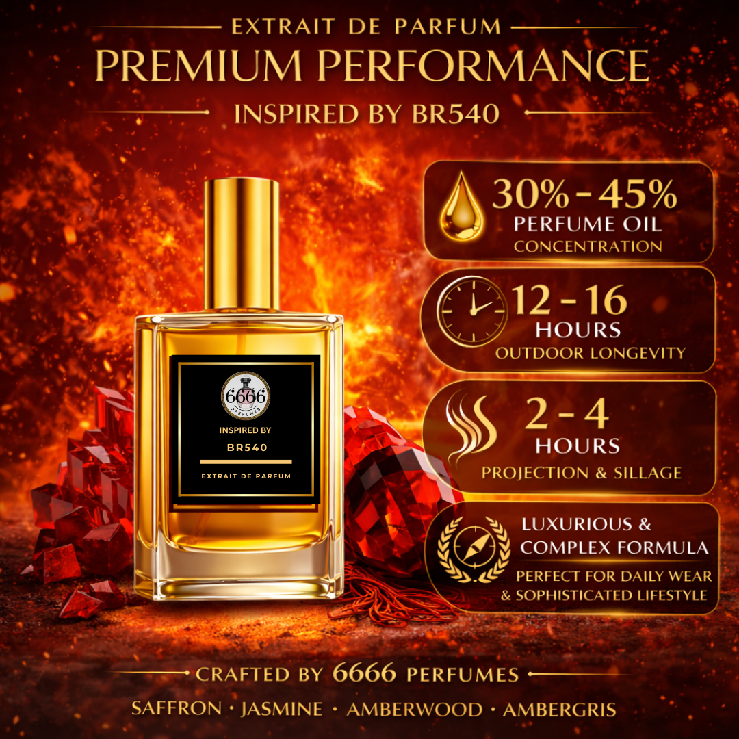🔥 The Ultimate Amber-Woody Luxurious Signature — Now in a 45% to 50% Superior Extrait for Indian Heat. Inspired by the iconic Baccarat Rouge 540 DNA, our Superior Extrait reimagines saffron, jasmine and ambroxan into a resilient, long-lasting extrait engineered to perform in 40°C+ climates while preserving the crystalline floral-amber elegance of the original.
