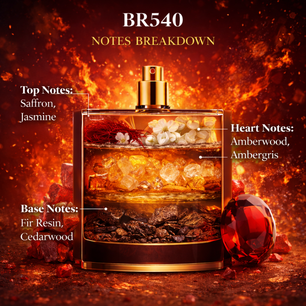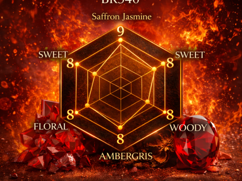 BR-style fragrances rely on crystalline facets (sugar/amyl-like top), saffron warmth, jasmine floralcy and an ambroxan-driven air. Our Superior Extrait uses high-quality ambroxan and amber complexes balanced with saffron accents to replicate that luminous signature with superior longevity — while maintaining clarity and avoiding heaviness.