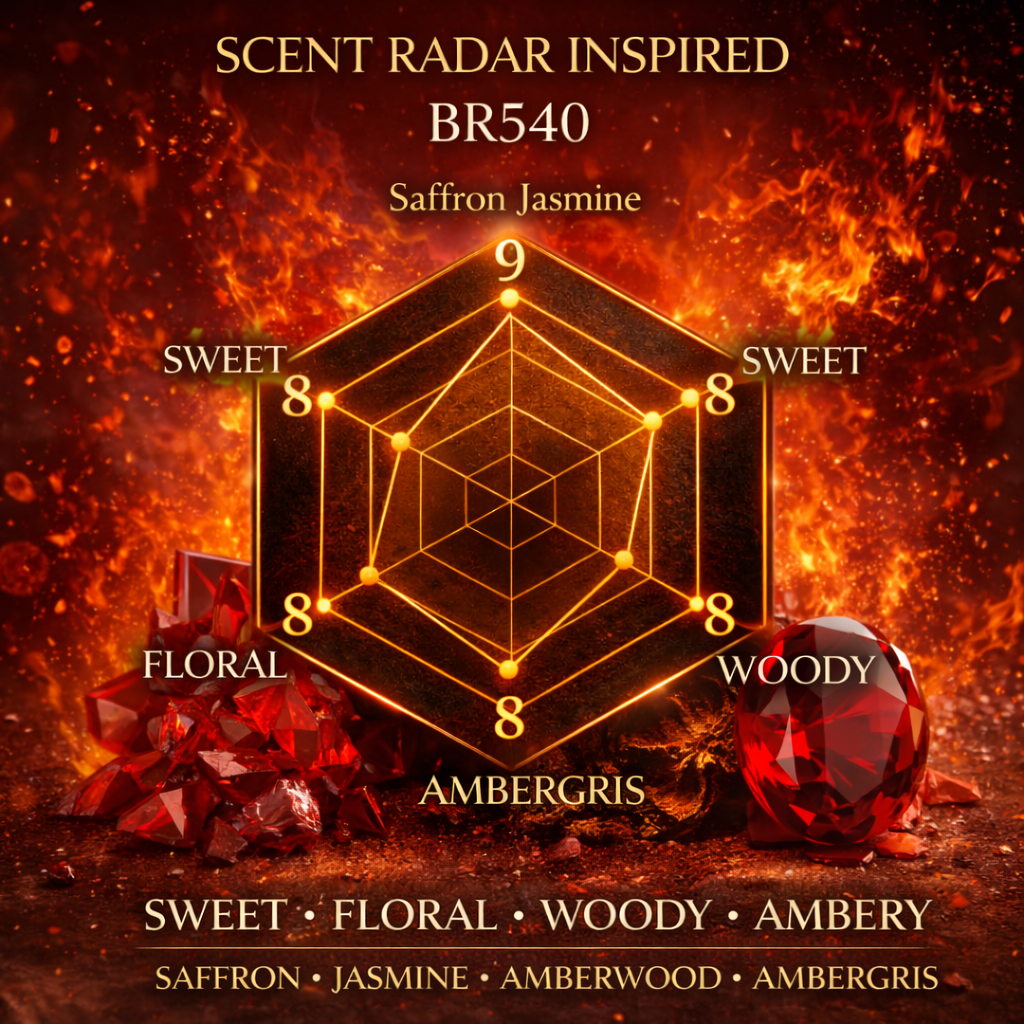The BR 540 inspired Superior Extrait delivers a luminous amber-woody experience: an opening of honeyed saffron and radiant jasmine fused with crystalline sugared facets that feel both radiant and gourmand. The heart blooms into jasmine and soft woody nuances while ambroxan and cedar create a shimmering, long-lasting radiance. The dry-down settles into warm amber, cedar, and an ambergris-like creamy embrace that lingers on skin and fabrics.