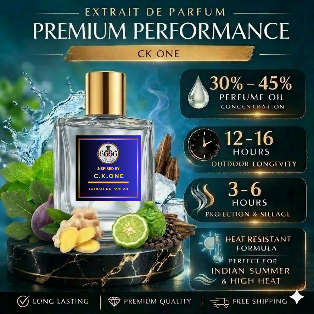 Most designer fragrances such as the original CK One are released as Eau de Toilette (EDT), which prioritizes lightness over longevity. Our version upgrades the DNA into a high concentration Extrait de Parfum, dramatically improving performance for Indian climate conditions.