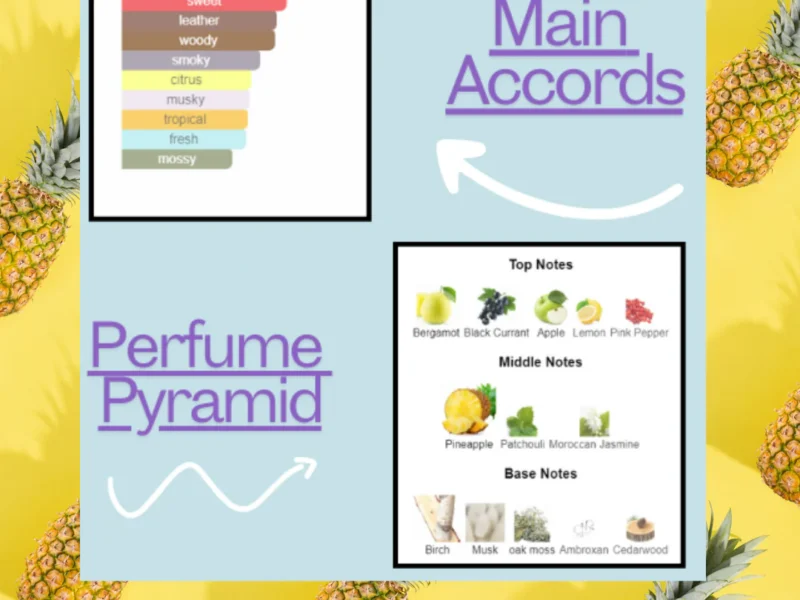 The fragrance opens with juicy pineapple and fresh bergamot delivering a bold, confident first impression.