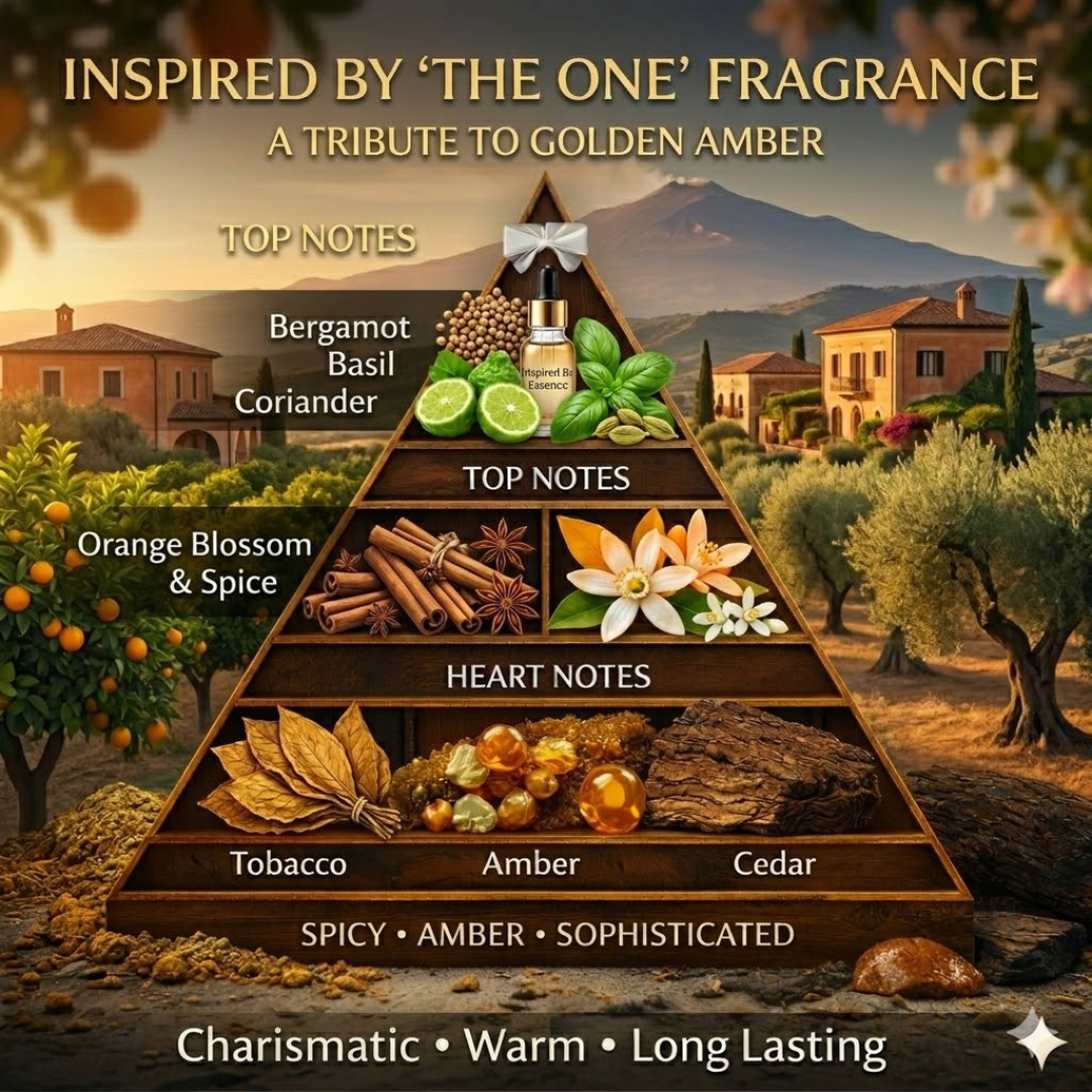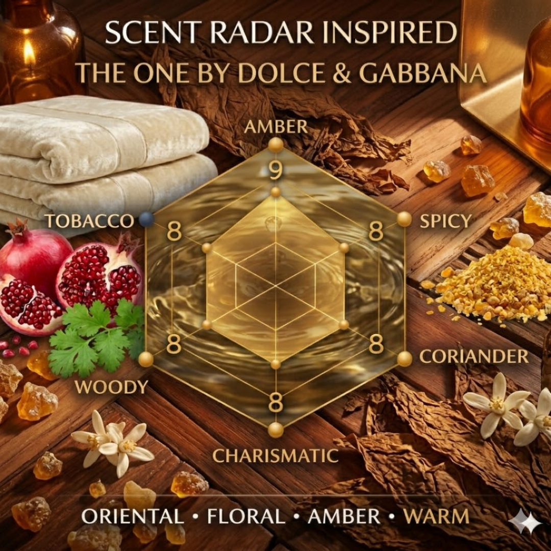 The opening introduces a bright yet spicy blend of grapefruit and coriander before transitioning into the signature tobacco heart. Smooth, masculine, and irresistibly warm, this Dolce & Gabbana The One inspired extrait captures the romantic DNA while enhancing depth and longevity.