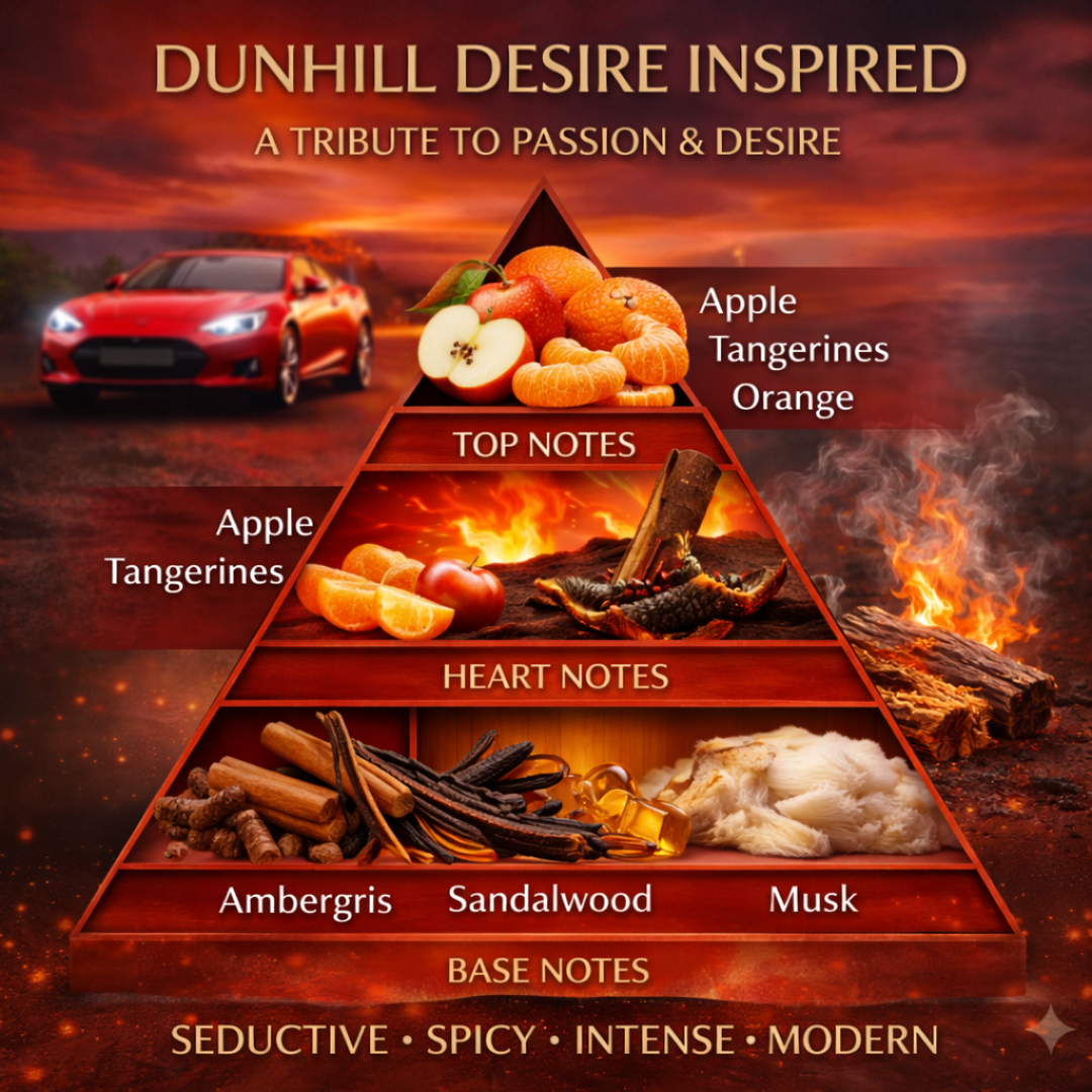 The essence of Dunhill Desire unfolds with vibrant top notes of fresh citrus and spiced nuances. As it develops, it reveals a warm heart of rich amber and floral accords, creating an intriguing contrast that lingers beautifully.