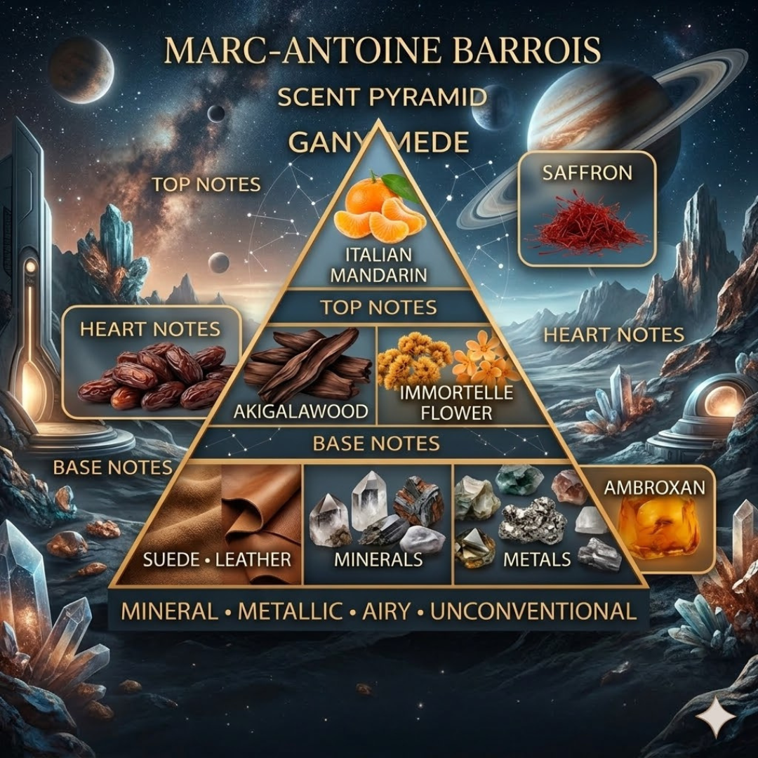 The heart introduces soft suede-like leather blended with mineral accords, creating a smooth, modern scent that feels futuristic and refined.