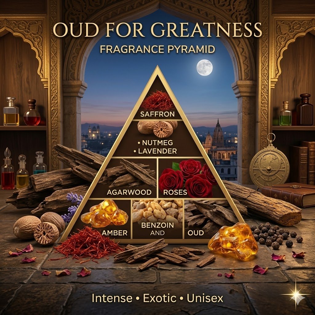 The dry-down produces a dark resinous aura built around luxurious oud, warm amber facets, and lingering musk that remains present for hours. The result is a bold and sophisticated oriental fragrance engineered for luxury evenings, signature scent wear, and statement fragrance lovers seeking a powerful Oud For Greatness alternative India edition.