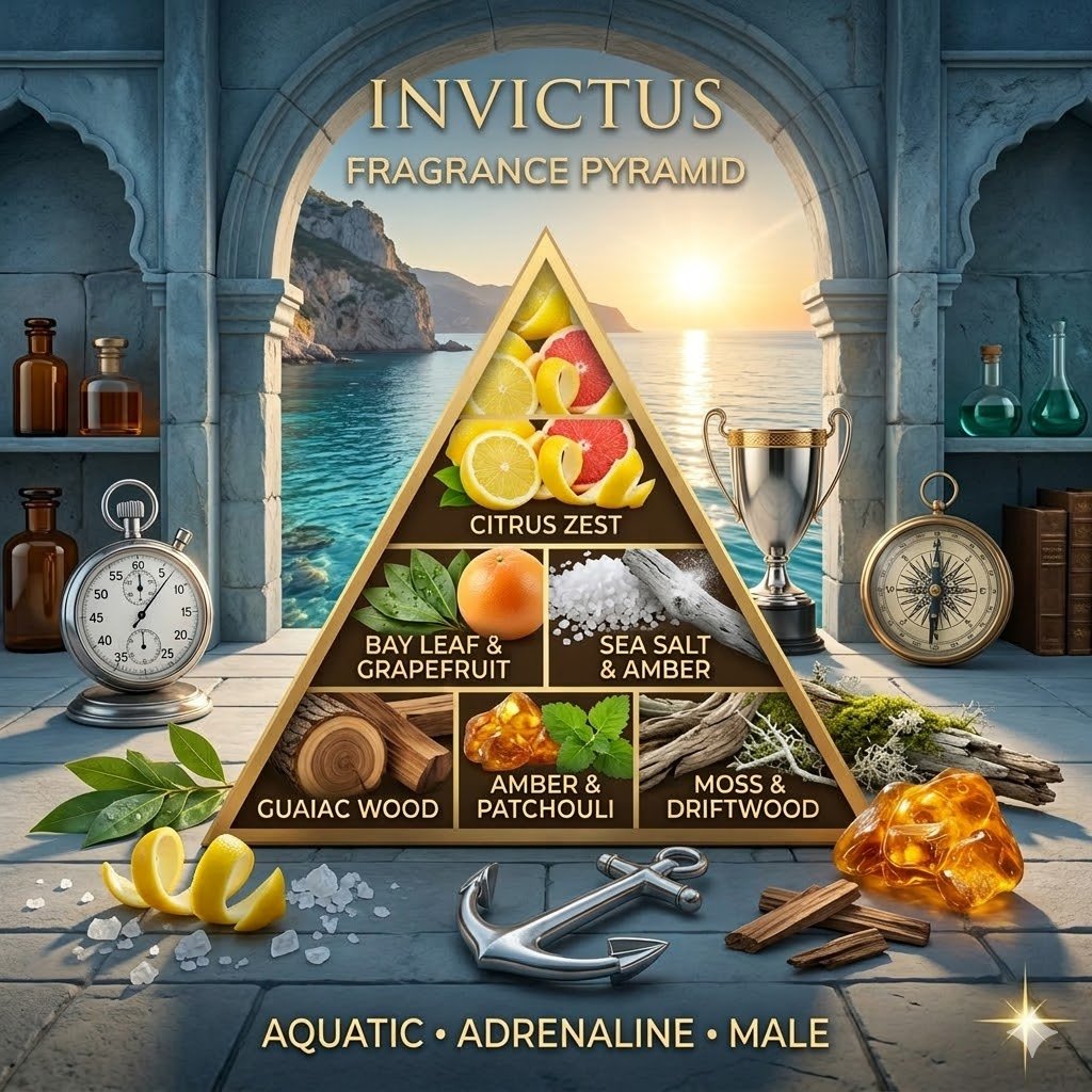 Invictus inspired fragrances combine fresh citrus notes, marine aquatic accords, aromatic bay leaf, and warm amber woods. The overall scent profile feels energetic, clean, and masculine.