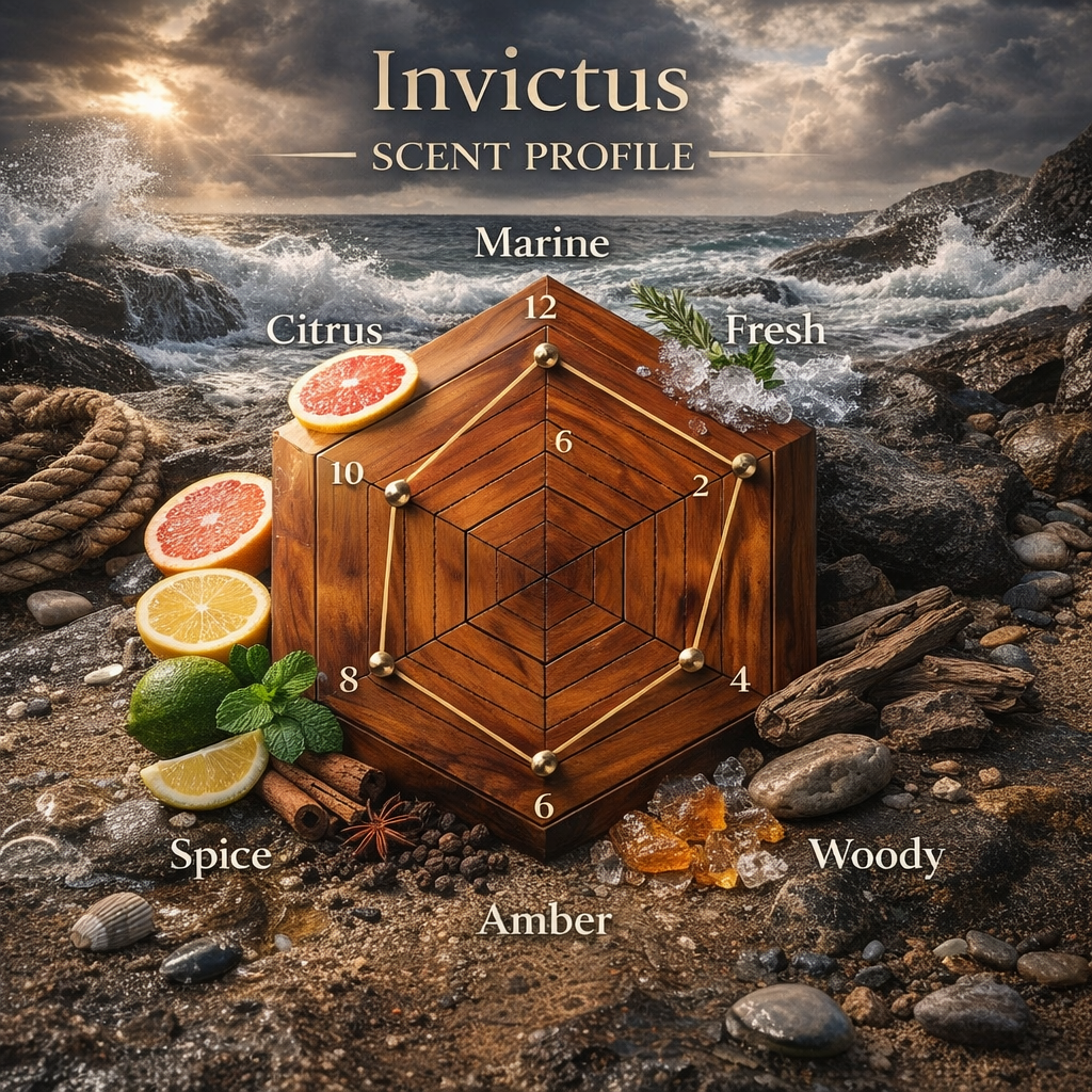 Typical Invictus note structures include grapefruit citrus, marine accords, bay leaf aromatics, jasmine, ambergris, and woody base notes.