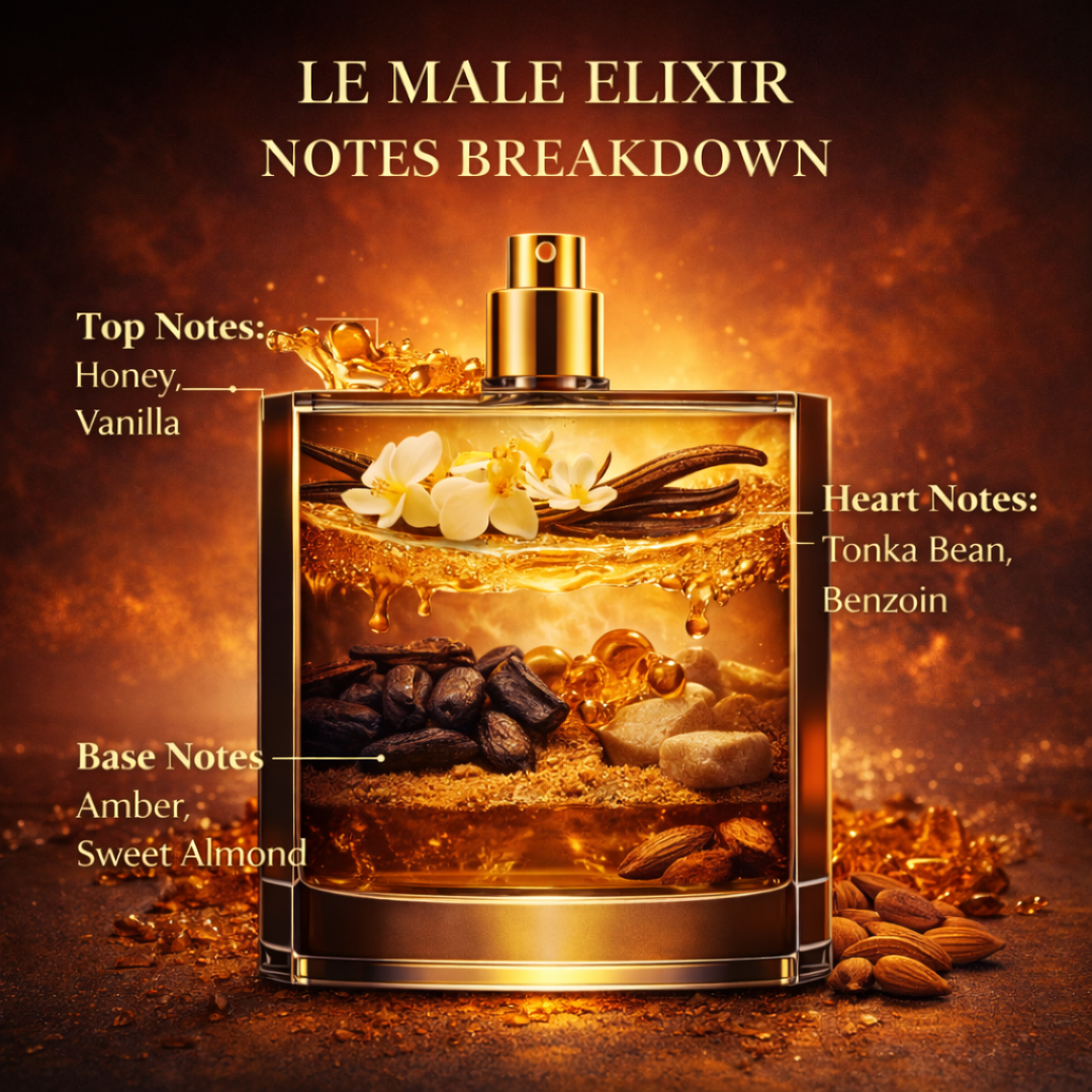 The fragrance opens with aromatic lavender balanced with sweet honey warmth that creates a bold and addictive opening. This opening quickly establishes the rich masculine character that makes Le Male Elixir one of the most powerful sweet fragrances in modern perfumery.