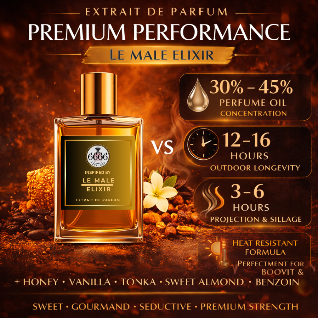 With 30% to 45% oil concentration, this JPG Le Male Elixir inspired perfume typically lasts between 8–12+ hours on skin and even longer on clothing. The higher Extrait concentration allows the honey sweetness and vanilla base to remain noticeable throughout the day.