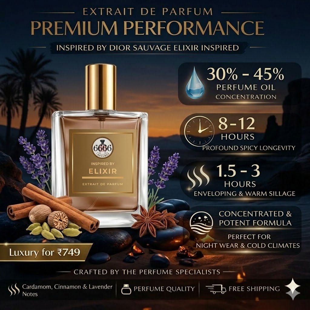 Looking for the best Sauvage Elixir inspired perfume in India? This high-performance fragrance recreates the bold DNA of Sauvage Elixir while delivering superior longevity using Extrait concentration (30% to 45% oil).