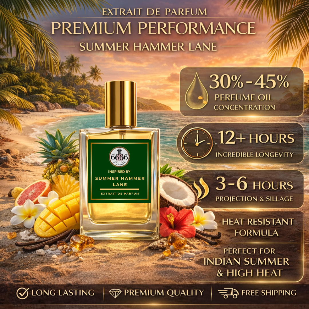 Many fresh fragrances struggle to maintain longevity in hot climates. Summer Hammer Inspired Perfume is formulated using Extrait concentration containing 30% to 45% fragrance oil which improves stability and longevity in warm weather environments.