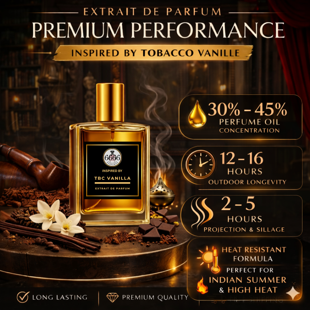Many low-cost Tobacco Vanille clone India options collapse quickly or become overly sweet during extended wear. At 6666 Perfumes, every formulation is engineered in true Extrait de Parfum concentration (30% to 45%) with structured development, climate stability, and controlled projection — not just surface-level resemblance.