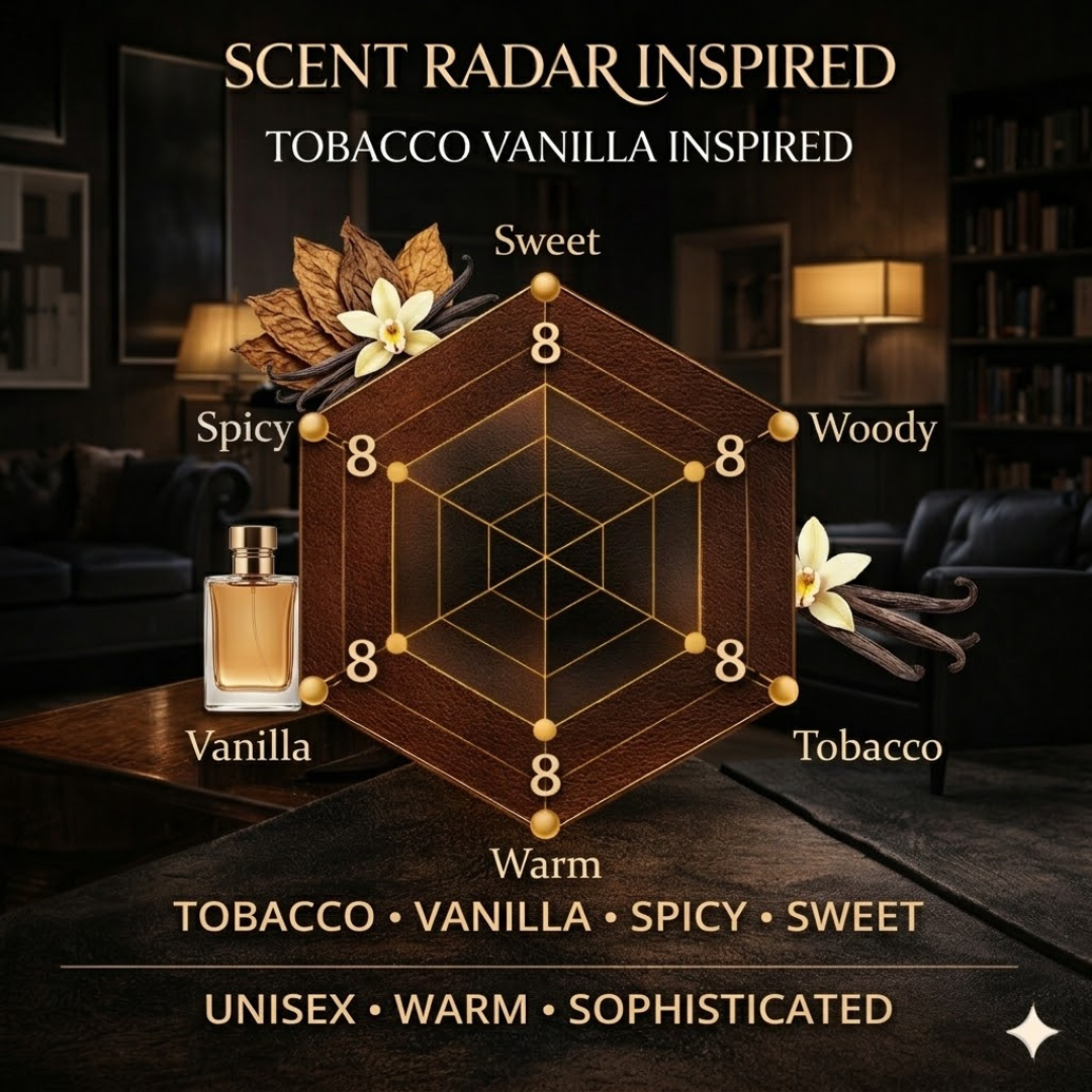 The opening introduces rich tobacco leaf with subtle spice warmth — deep, smooth, and instantly luxurious. The heart transitions into creamy vanilla layered with cacao nuances, creating addictive gourmand depth.