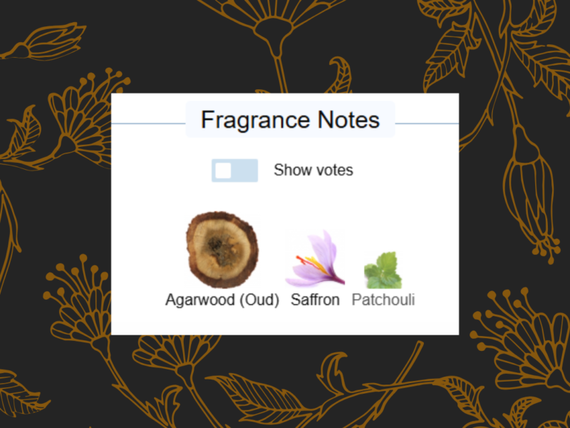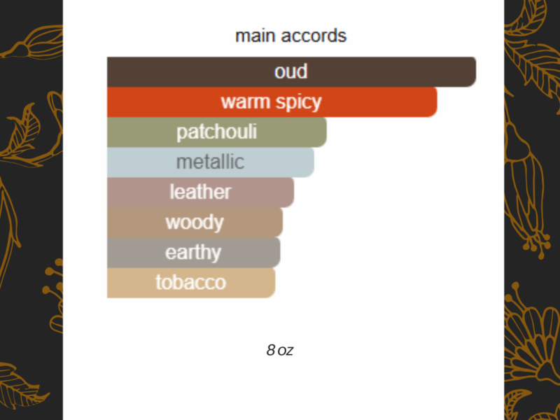 Oud plays a dominant role supported by saffron spice and patchouli depth, creating a rich woody oriental profile.
