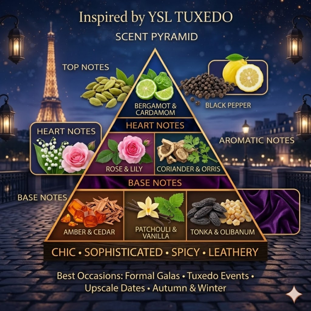 Tuxedo-style fragrances belong to the amber spicy woody family, known for their balance of freshness and warmth. These are considered some of the best luxury perfumes for men because they project confidence and elegance.